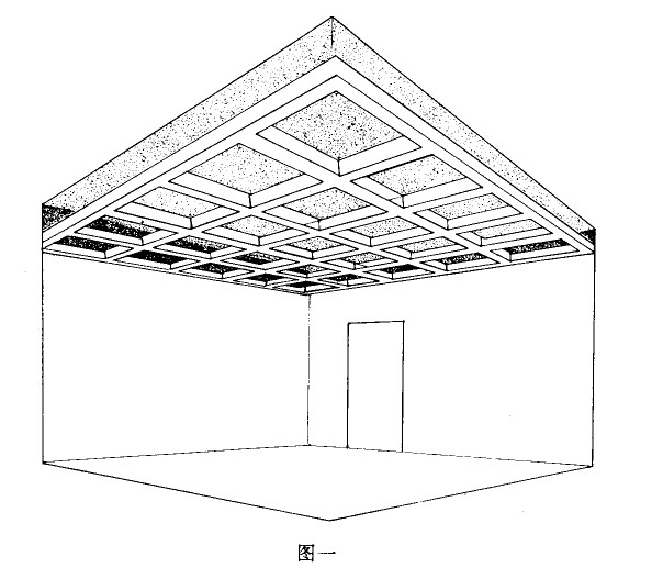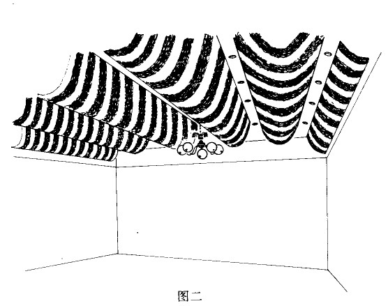 二、半藏式:这种天棚结构不是完全封闭的,一部分露顶,一部分藏顶,也可称其为透空吊顶。材料一般使用木材、塑料、铝型材、纤维制品等装修。形式结构有板条式、栅格式、天幕式等。整体平面半隐半封,形式新颖别致,色调变化多样,天花本身富有层次,给人一种明快的效果。(如图二)