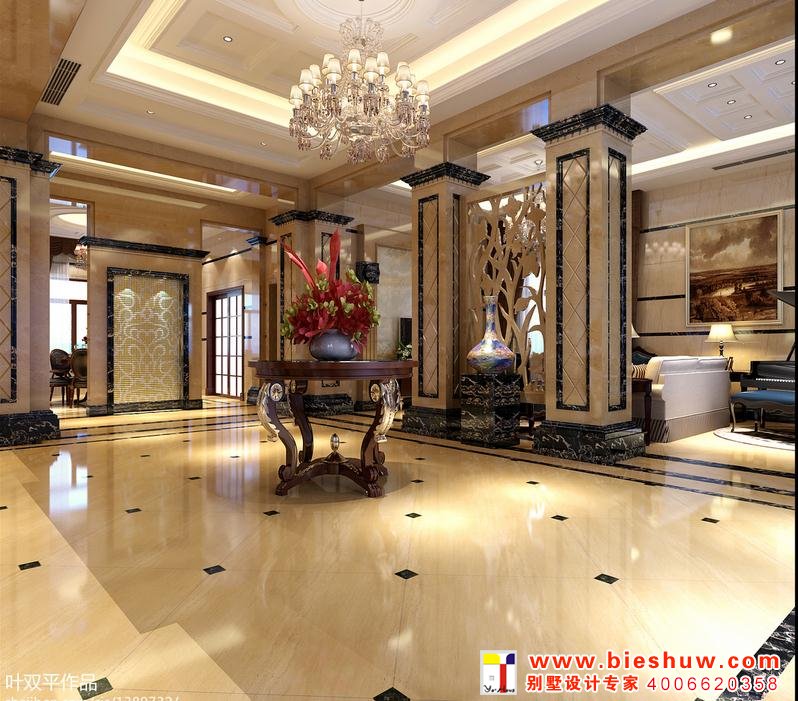 别墅欧式装修上使用地面模式的隔断也很常见,这样的隔断是用来划分家居的区域的。最为常见的地面模式的隔断就是采取了不同色彩的、不同花色的地板砖进行划分。玄关位置可以使用一些比较吉祥的图案地板砖,客厅所在的地方,可以使用面积比较大的地板砖来划分地面空间。此外,我们也能够采用地毯来隔断,这也不失为一种比较高端的地面模式隔断。