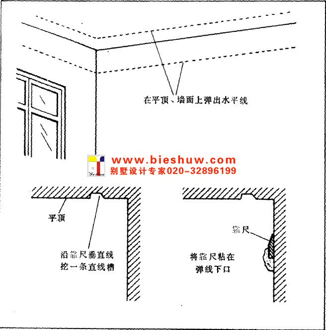 1、平顶与墙面交接处留出底子不抹灰,以便在空隙处粘贴靠尺,但一般居民分配到的新工房,平顶墙面都已做好,因此应根据木模尺寸在墙面,平顶上弹出水平线,再根据木模垂直方向,定出上下稳定靠尺的位置,弹出垂直线。在上靠尺位置上凿出一条直线,以嵌入木模侧板上口,顶端要凿大,以便退取模子;