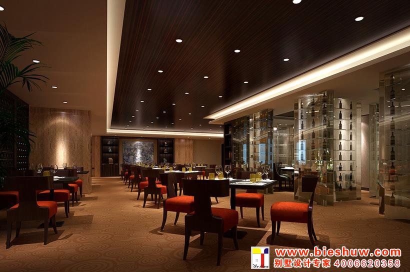 (2)自助餐厅设计灯光点染用餐的气氛:灯光在餐厅的设中计占据极重要的一环,在造型上以垂钓式的吊灯为主,辅以射灯或筒灯等,营造一方层次分明的“光彩”空间。日光灯在照明上虽然充分,但惨白青灰的色泽,不禁使人颜面失常也会引起对冷调环境的倦怠感,所以日光灯是餐厅不宜使用的灯光。