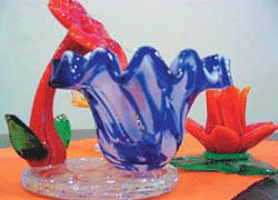 玻璃在色彩和款式方面都较为灵活多变,因此在许多家饰品商店都有货架摆放不同种类的玻璃饰品供顾客选购。据了解,那些造型小巧玲珑、色彩夺目的玻璃饰品尤其受到女士们的欢迎。例如近来比较流行的玻璃烛台,一朵鲜艳欲滴的玫瑰花,花苞刚好用来摆放一根蜡烛,翠绿的叶子则设计成烛台的底部,简单而实用。在餐桌上摆设这样一个小烛台,再点上一根小蜡烛,就可以营造出浪漫的气氛,即使在家中也能够享受“烛光晚餐”。此外,喇叭花形的小瓶子、各种各样的小花篮、玻璃杂志夹等。这些小玻璃饰品的价格一般在百元以下,是实惠又时尚的小摆设。