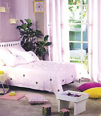 温馨入梦 卧室是最能展现生活品质、满足生活舒适度的地方,有美丽的床才会有美丽的梦,床是整个卧室空间的视觉焦点,是卧室的主题,而寝具是卧室的衣裳,有了漂亮的衣裳,卧室的情趣自然油然而生。为你的床准备几套不同的衣裳,在气温逐渐增高的时候,撤掉隆冬热烈、厚重的寝具,让薄荷绿和粉红、粉紫等柔媚色彩,为您带来清凉的夏季感受。个性、民族与欧陆风格正是时下寝具装饰的主流。