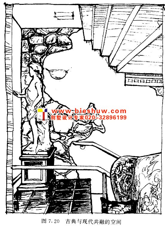 如图7.20所示,光滑的墙面与石块砌筑的部分形成了鲜明的对比,以此墙面为背景,利用色彩和材质的变化以及古典雕塑共同构成一个古典与现代共融的空间,抒发了一种情思。