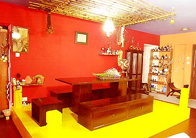 整个房子的焦点落在红色墙壁,配上黄色平台的饭厅上,再加上设计有别于一般的饭桌设计,以及天花板的竹竿装饰,让人不禁要多看几眼。