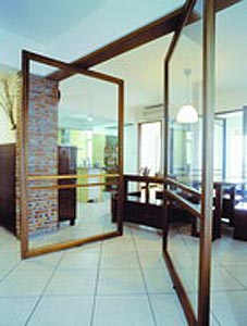 他们在餐区的两侧各安装了两扇非常大的玻璃门,门用轴承与天花板以及地面连接,有一点风四扇门就会转动起来,空间因此也活了起来。同时,不少客人对这四扇特立独行的门都有疑问:为什么不用更节省空间 推拉门 ?答案当然是因为缺乏动感与个性。