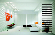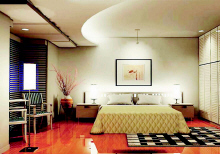 客卧:简洁、肃静是客卧设计上的基本原则。四白落地的空间内,床、电视、音响、书、灯光满足了居住者对空间功能的需求,也构成空间的主要装饰要素,简约中透着大气和精细。