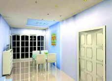 餐厅:本案设计初看略显空旷,但这正是设计师在餐厅设计上追求的一种意境效果,也符合客户杨先生″安安静静就餐″的习惯和要求。为突出餐桌的位置,设计者在白色墙面上配以天蓝色块点缀,海贝壳串成的小挂饰产生无限的遐想,给人一种海天一体的心理与视觉享受。