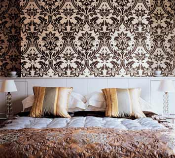 卧室中墙纸的图案被大面积重复使用在枕头、软垫和床头灯上,从而创造出一种强烈而突出的背景。浴室里,同样图案的墙纸与瓷砖巧妙地搭配出一幅平静的图画。