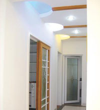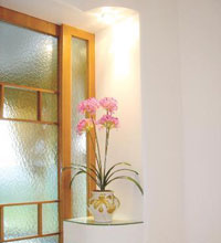 在打造简洁舒适的居室环境的同时,主人丝毫没有忽视室内的各色点缀。五光十色、绚烂夺目的灯饰,可以说是王先生的得意之作。客厅的中间是一盏带有几分古典的花瓣 吊灯 ,水晶灯罩在灯光的映衬下晶莹剔透;餐厅是一盏现代风格的水晶灯,透露出明亮的黄色灯光,尽显家的温馨。客厅前后的墙角镶嵌着蓝色的灯饰,淡淡忧郁的蓝色让人感怀。灯光的交相辉映,让矜持的客厅多了些许撩人的妖娆。