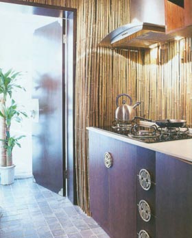配合中式风格的厨具设计,厨房的墙面利用了细竹装饰,好一个具有中国文化底蕴的现代化厨房。不过在细竹的选择上要注意选择竹子的粗细要一致,否则会适得其反。