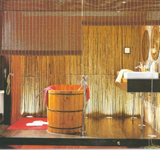 在开放式主卫中,整块墙面都用了细竹装饰,感觉像是到了一片竹林。与之营造同种感觉的木桶和墙面上的铜镜,起到了画龙点睛的作用。在卫生间的入口处挂了两块草帘,兼作 隔断 与装饰的效果。