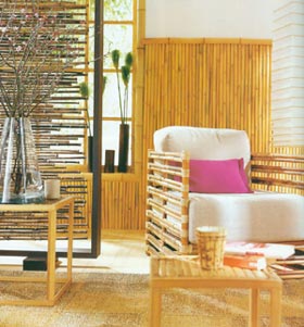 用中等粗细的竹子包的门窗,同时,在房间墙面的下方1/3处采用了细竹包墙装饰,避免了满墙的竹子装饰导致空间显得过分拥挤和压抑。再配合竹质家具和纸质灯具,使整个客厅呈现清新自然的舍适感觉。