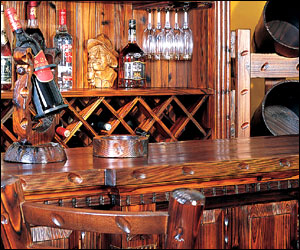 以精致的做工创造粗糙的效果。吧台桌 7650元 吧台柜 9945元 小酒架 460元 烟灰缸 160元 比利时吉万达家具