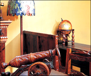 西班牙乡村风格家具同样注重雕刻,压痕都是人工刻意制造的效果,给人田园般的质朴。餐桌4005元 餐椅 1300元 古炮装饰品 1050元 落 地灯 5800元 后面长桌 3456元 长椅 2205元 地球仪 1335元 比利时吉迈达家具