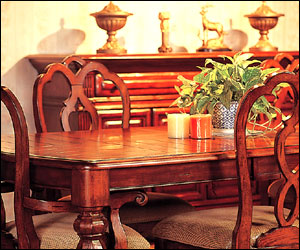 美式乡村风格家具特有的椅背、桌脚和宽大尺寸,给人留下深刻的印象。餐桌13920元 扶手椅 3000元 餐边椅 2560元 餐边柜 23048元 环美国际馆