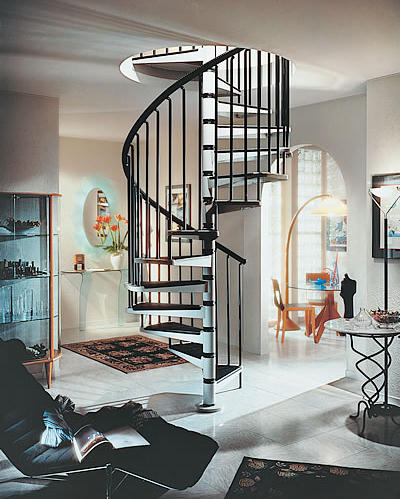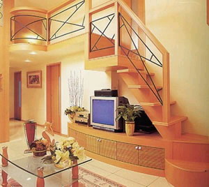 这实际上是木制品和铁制品的复合楼梯。有的楼梯扶手和护栏是铁制品,而楼梯板仍为木制品;也有的是护栏为铁制品,扶手和楼梯板采用木制品。选择这种楼梯的客户也不少,比起纯木楼梯来,这种楼梯似乎多了一份活泼情趣。现在,楼梯护栏中锻打的花纹选择余地较大,有柱式的,也有各类花纹组成的图案;色彩有仿古的,也有以铜和铁的本色出现的。这类楼梯扶手都是度身定制的,加工复杂,价格较高。铸铁的楼梯相对来说款式少一点,一般厂商有固定制造的款式,客户可以从中选择。色彩可以根据客户要求加工。比起锻打楼梯,铸铁楼梯显担的中国人来说,低价的诱惑往往是最重要的。但在未来的家居设计发展中,楼梯的家具化将是一个必然的趋势。