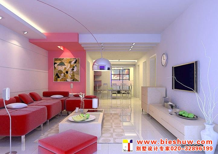 粉红色:给人以温暖、放松的感觉,适宜在客厅里使用。如地板用柔和的粉红色,然后再选用同色的布艺靠垫以及有粉红色印花的窗帘,在白色的沙发、米黄色墙的衬托下,再加点儿淡蓝色,就会形成花坛般的罗曼蒂克格调,颇适合年轻人的品位。