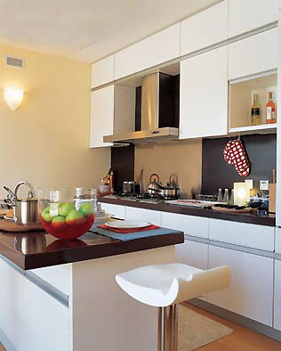 图一中的厨房就是通过局部重色的点缀,然后配比大面积的浅色系地砖,让居室空间看上去高挑但又不失重点,叶国密说,开放式厨房的顶面采用磨光的黑色石材,表面光滑如镜,能够反射居室光线,与高亮度地砖形成强烈对比,这种方式不仅可以在开放式厨房中使用,对于小户型的吊顶也不失为一种剑走偏锋的方式。