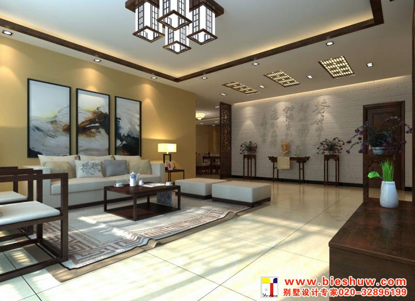 因为中国古典文化讲求字画合一,所以在画的两旁配一副对联则更显古朴。对联的字体以行、草为佳,体现出一种流动性,内容力求与挂画相衬,长度下与挂画平齐,上部留2/3字的空间作为空白与画和齐。再在厅堂丽的上部与天花板处成45度角俯视佳一幅能体现整个厅堂风味的题词,如“万光堂”、“雅楼”等,既可增强房顶的空间层次感,又能体现主人的文化素质。如果能在天花板上柱与间挂上中国古典的宫灯,则更能营造古朴气氛。