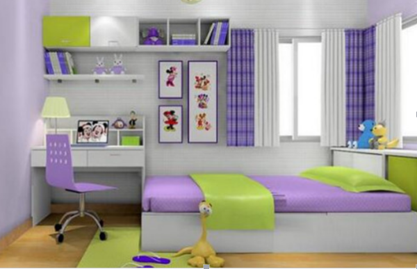 孩子们天真活泼,他们总是被色彩绚丽的东西所吸引。图中这款孩子房在色彩装饰上别具一格,紫色、白色、草绿色碰撞出一个多彩的世界。卧房的功能也很强大,书桌、吊柜、层板的设计让空间显得非常地充裕,而且互不影响。