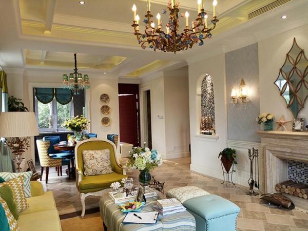 4、法国乡村:主要在家具的美白处理和大胆的色彩搭配上,以明亮的色彩设计为主色调,家具的美白处理可以使家具呈现出古典红、黄、蓝的颜色搭配。土地肥沃的景观被展示出来,弯曲的线条和精致的腿部图案也是法国优雅乡村生活的体现。