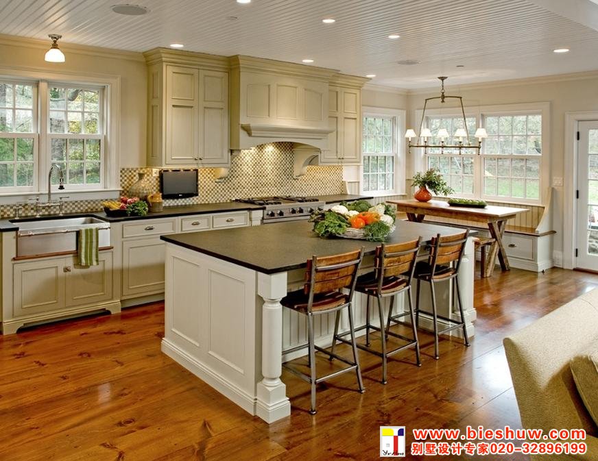 开放式厨房装修设计有讲究。规划全体的厨房空间两头打通,作为衔接起居室以及野外花园的一个桥梁。一侧规整的橱柜设置,中心的餐桌相同也能作为备餐桌之用,分工清晰、规划全体的空间也是家居装饰之中的重要部分。