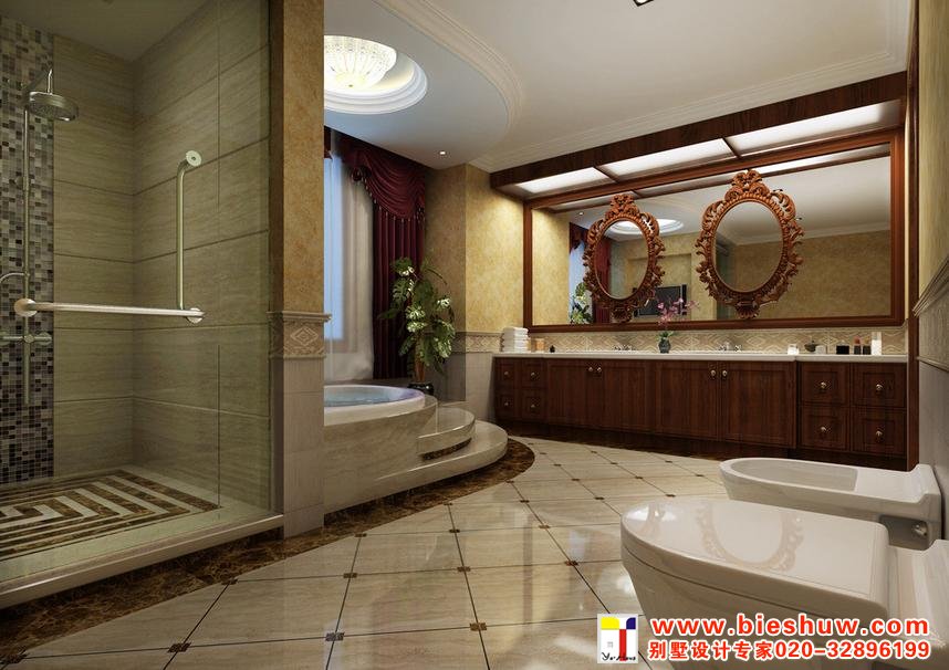 吊顶:浴室吊顶可以根据不同造型,选用多种材料,如平顶可以用PVC扣板、铝扣板、塑铝板,配以轻钢龙骨。而穹型等艺术吊顶可以选用软一点的防水板、软板、塑铝板,或再饰以多种彩色玻璃装点。从一般吊顶高度而言,发达国家的家庭卫生间大都较矮,而国内不少住宅中,卫生间的屋高等同于其他房间,所以为了避免空荡、冷寂,一般吊顶高度可设计在2.2米-2.4米之间。在面积超过8平方米时,不妨在洗面盆上方安装化妆品柜,离水源较远处挂置储衣箱,或划出一块地方做日常更衣之用。