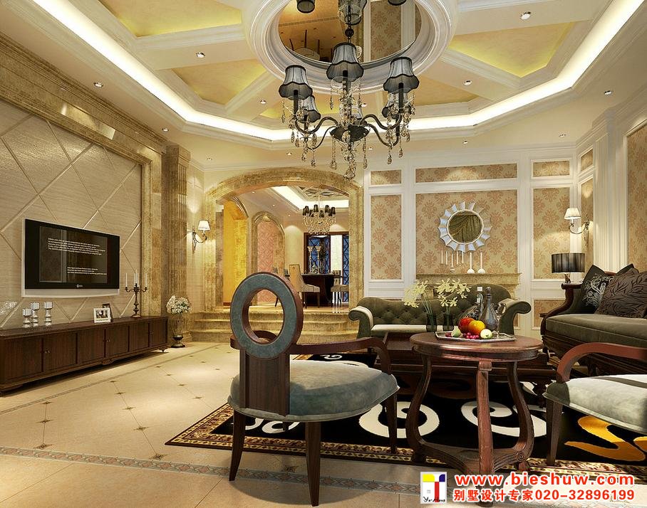 2、因为欧式别墅设计进门就能将业主的眼球吸引在这两套宽大的沙发上,所以整个空间显得大气、奢华。在墙纸选择上,设计师别具匠心,将业主喜欢的梅花图案定制在墙纸上,体现出了业主不一样的艺术气质。铁艺的角几、叶片似的灯具等将后现代独特的内涵展现出来。