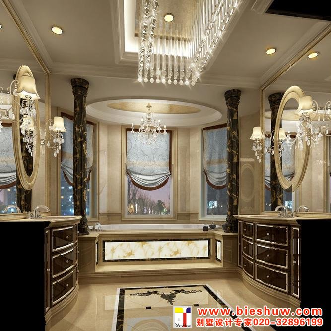 别墅型的卫浴空间,可安装按摩浴缸、多喷嘴沐浴房、大理石面板的洗面化妆台、电动吹风器、剃须器、大型浴镜、热风干手器和洗手器等。墙面或地面可铺设瓷砖或艺术面砖,地上再铺地毯。此外还可安装恒温、通风和通讯设施等。