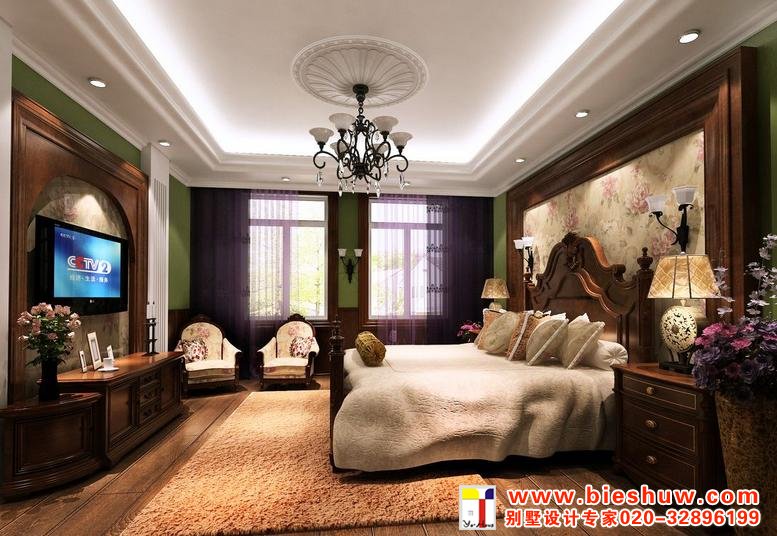 别墅装饰卧室中的书桌、椅通常不要与床太靠近,避免搅扰睡觉者,而电视柜通常与床相对安置,面积较为宽余的卧房,可在与电视柜相对处摆放休闲沙发。