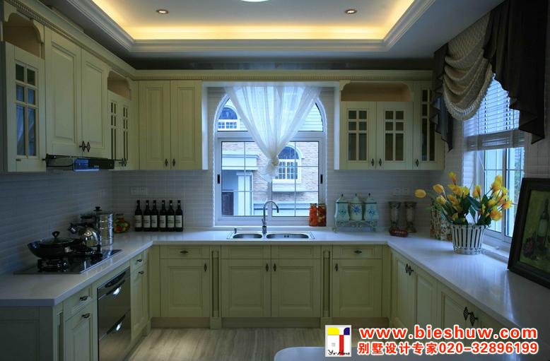 别墅厨房装修首先要满足洗、切、炒的三大基本功能,如果面积大还可以考虑放置冰箱、洗衣机,甚至兼做餐厅的功能。