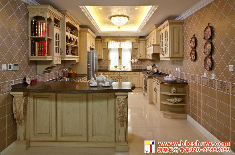 别墅中的厨房与一般普通户型的不同在于面积较大,层高也相对较高,并且业主对其的功能也与普通家庭中厨房的要求略有不同,很多别墅要求厨房要同时兼具中厨和西厨的功能,并且还要满足偶尔的聚会,因此,此时对于厨房的设计要求就很高。一要满足整个装修风格与整体风格相协调,二是在保证其功能的前提下,要有充足的储物空间和活动空间。此外,要对厨房空间进行分割,一般采用岛式或者半岛式布置,在岛的上方可以设计铝制吊架、实木系列吊架、玻璃吧台等。既可以充分利用空间,又让使用极为便利。在空间允许的情况下,可以在厨房的一侧设计一排筒柜,把冰箱、烤箱、消毒柜、卷帘门全部集中在此,显得很有气势。
