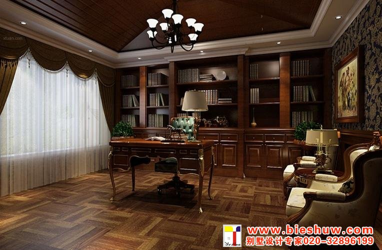 在书房的规划中,首要应当满足其关于书本的收纳功用。将不一样标准种类的书本彼此阻隔开来,进行具体的分类来规划出一个较为适宜的书橱。一起书橱的规划应当选用欧式的规划个性,即在其外形上选用雕花或镏金等不一样的外型来体现出其奢华欧式风情。