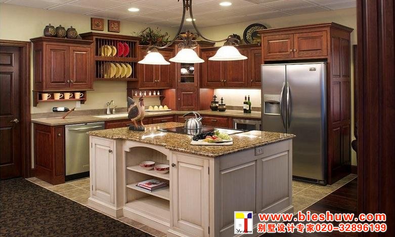 一、空间设计应当出现运用率高的特色与通常户型对比别墅厨房的面积大、层高(径向)较高,通常都在3米以上。房主常常在这儿举办PARTY等集会活动。作为一个交际场所,在设计厨房时充分地运用高度方向上的空间,在满意了根本的储物空间、操作空间的前提下,要留有满意的活动空间。此外,要对厨房空间进行分割,通常选用岛式或许半岛式安置,在岛的上方能够设计铝制吊架、实木系列吊架、玻璃吧台等。既能够充分运用空间,又运用极为便利。在空间答应的状况下,能够在厨房的一侧设计一排筒柜,把冰箱、烤箱、消毒柜、卷帘门悉数会集在此,显得很有气势。